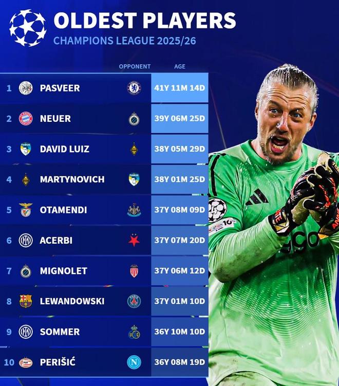 北京时间10月25日,德转统计出了本赛季至今欧冠出场最年长的10名球员,阿贾克斯的门将帕斯维尔第一,诺伊尔第二,目前效力于塞浦路斯球队帕福斯的大卫-路易斯第三。本赛季欧冠最年长出场球员前10:1. 帕斯维尔(阿贾克斯) 41岁11个月14天(vs切尔西)2. 诺伊尔(拜仁慕尼黑) 39岁6个月25天(vs布鲁日)3. 大卫-路易斯(帕福斯) 38岁5个月29天(vs阿拉木图凯拉特)4. 马蒂诺维奇(阿拉木图凯拉特) 38岁1个月25天(vs帕福斯)5. 奥塔门迪(本菲卡) 37岁8个月9天(vs纽卡斯尔联)6. 阿切尔比(国际米兰) 37岁7个月20天(vs布拉格斯拉维亚)7. 米尼奥莱(布鲁日) 37岁6个月12天(vs摩纳哥)8. 莱万多夫斯基(巴塞罗那) 37岁1个月10天(vs巴黎圣日耳曼)9. 索默(国际米兰) 36岁10个月10天(vs亚特兰大)10. 佩里西奇(埃因霍温) 36岁8个月19天(vs那不勒斯)