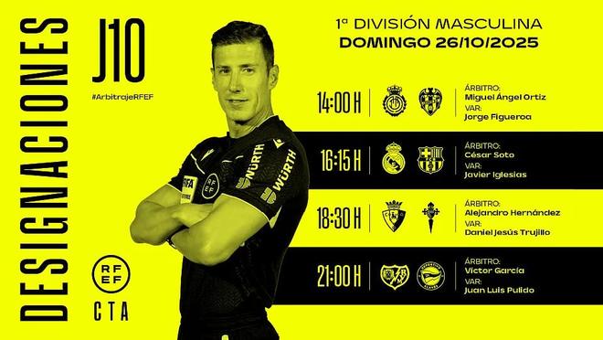 北京时间10月25日,西班牙足协公布了周日的4场西甲裁判人选,索托-格拉多将执法西班牙国家德比。从本赛季开始,西班牙足协在赛前一天公布西甲比赛裁判人选。北京时间10月26日,周日23:15,皇家马德里将在主场迎战巴塞罗那。这场西班牙国家德比,主裁判是索托-格拉多,VAR裁判是哈维尔-伊格莱西亚斯。