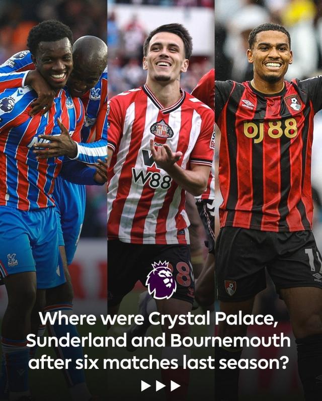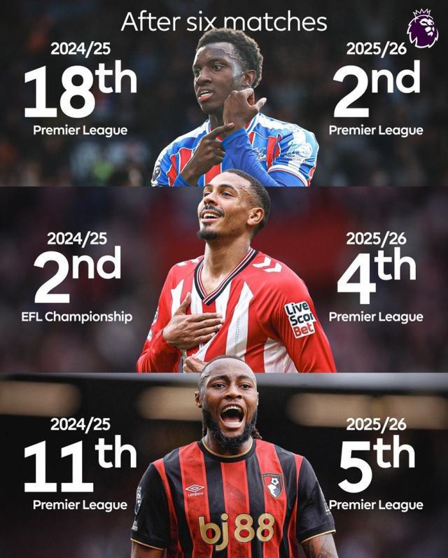 9月28日讯 英超官方更新社媒动态,称赞水晶宫、桑德兰、伯恩茅斯本赛季的表现。英超官方对比三队上赛季、本赛季前6轮之后排名:水晶宫——上赛季第18位、本赛季第2位桑德兰——上赛季英冠第2位、本赛季英超第4位伯恩茅斯——上赛季第11位、本赛季第5位独家看英超就在咪咕