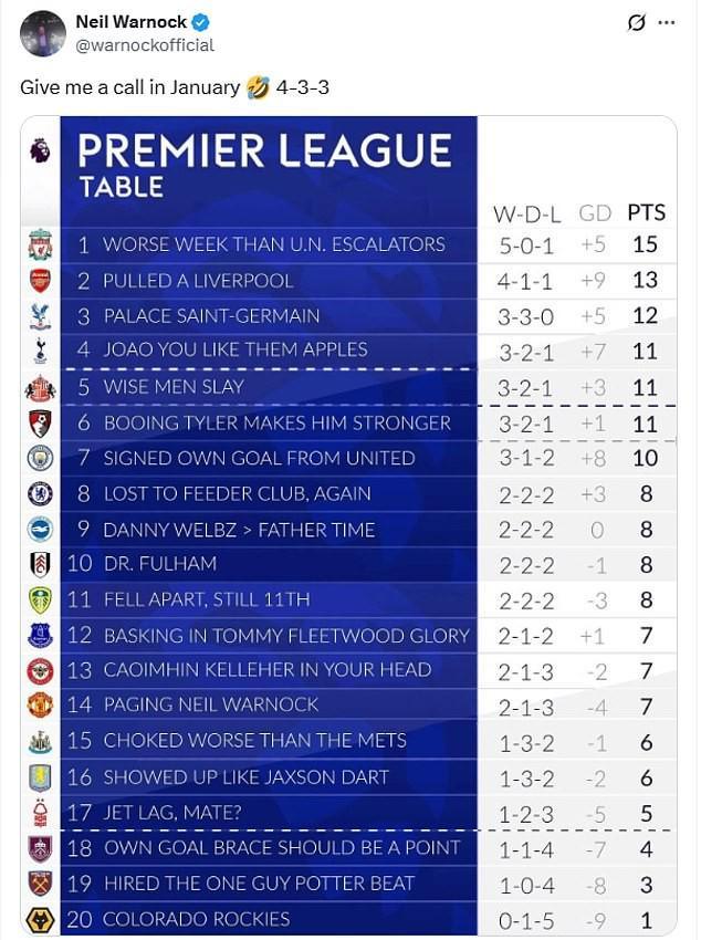 曼联现排名英超第14,新赛季前景不容乐观。在此背景下,76岁的传奇教练沃诺克在社媒平台上以一则幽默的帖子半开玩笑地毛遂自荐。由于阿莫林在老特拉福德承受着巨大压力,他在俱乐部的未来正受到前所未有的质疑。而沃诺克在一条列出各队排名并附有双关语的帖子下做出了回应。(积分榜上曼联的名字被替换成了:“呼叫尼尔-沃诺克”。)这位曾执教过20家不同俱乐部、以带领球队逃离降级威胁而闻名的老帅回复道:“一月份给我打电话吧!4-3-3。”尼尔-沃诺克开玩笑说曼联应该联系他,并表示他会改变曼联的阵型。他对4-3-3阵型的提及,正是许多球迷和评论员用来批评阿莫林的“武器”之一。沃诺克最初因在英冠联赛中的升级专家声誉而闻名,他曾带领谢菲联、QPR和卡迪夫城升入英超。在他的职业生涯后期,不少俱乐部也请他担任救火主帅。【上咪咕独家看英超